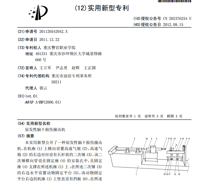该发明专利的公开资料显示,这是“一种本实用新型能较准确地制备中型动物的原发性脑干损伤模型[13]” 然而,专利公开说明书“背景技术”第一段:“脑干是人类的生命中枢,具有的重要机能意义,其损伤往往意味着严重头部创伤。原发性脑干损伤(primary brain stem injury)是指受直接或间接暴力后脑干即刻发生的损伤,其常见于交通事故伤、暴力打击伤和坠落伤。严重头部创伤人员中约53%出现了脑干损伤,因脑干损伤而致其存活时间低于48小时占70%。原发性脑干损伤在颅脑创伤中占3%~5%,因其而死亡的比例却高达71.1%。”这显然是对人类的脑死亡的描述。此专利“原发性脑干损伤撞击机”显然就是制造人类脑死亡的机器。